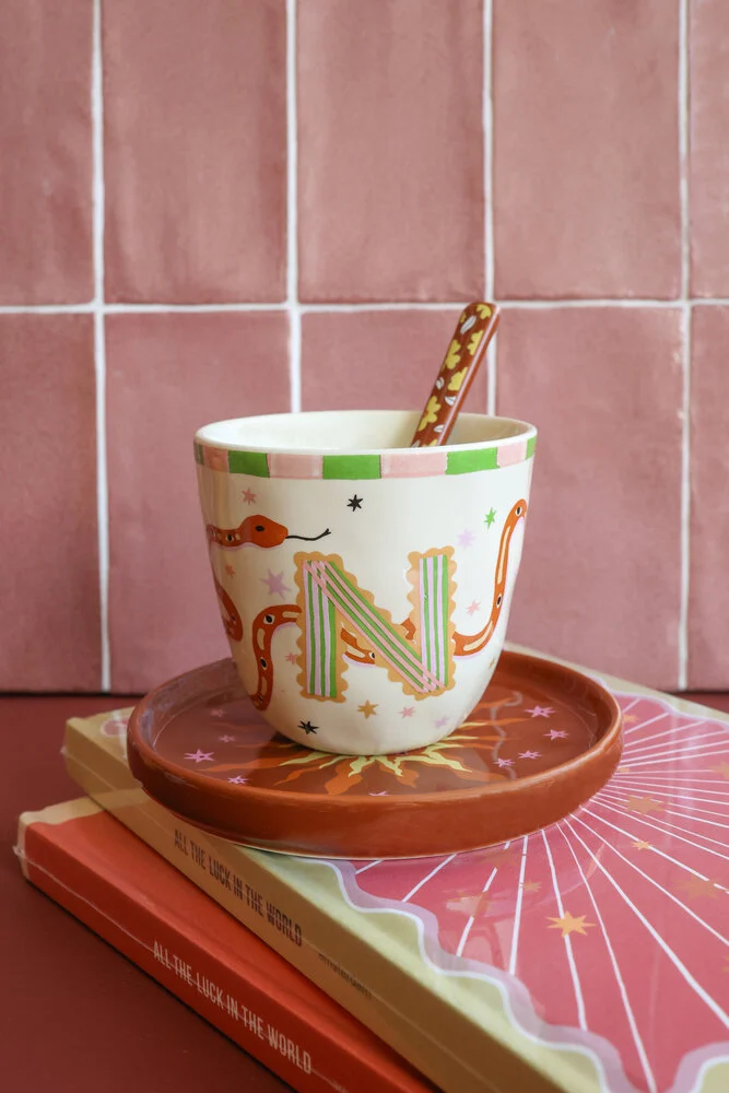 Koffie drinken was nog nooit zo leuk! Deze toffe beker is de perfecte manier om je dag te starten. Kies je eigen initiaal of geef het cadeau – het zal zeker in de smaak vallen! Elke mok heeft een uniek design, dus je kunt lekker mixen en matchen. Combineer de mok met een bijpassend bordje of lepel van All the Luck in the World.