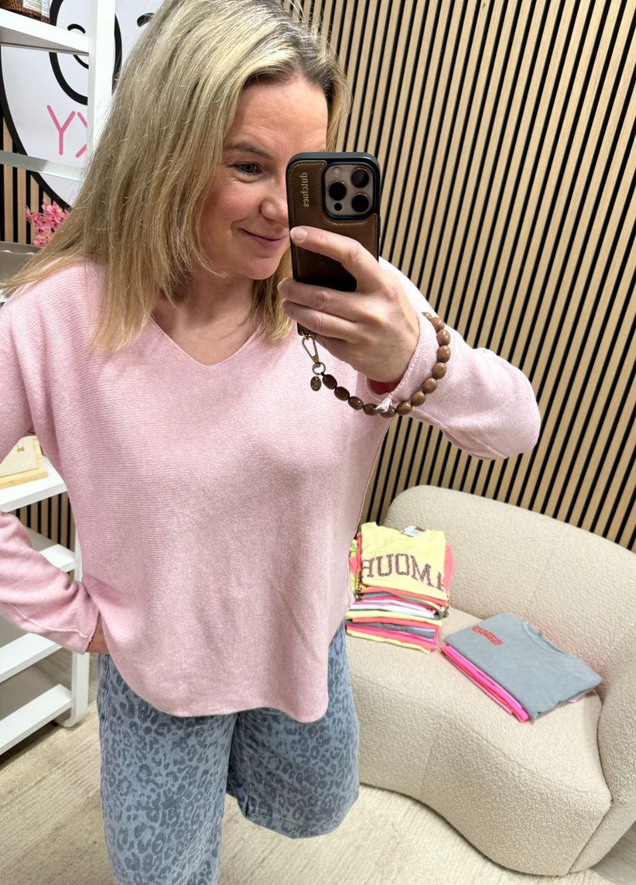 Fijngebreide top – lichtroze – diepe V-hals