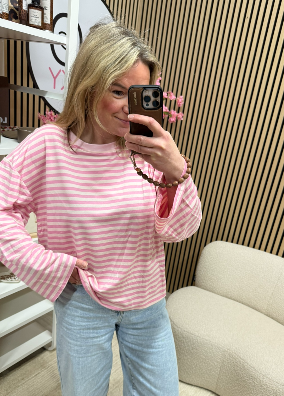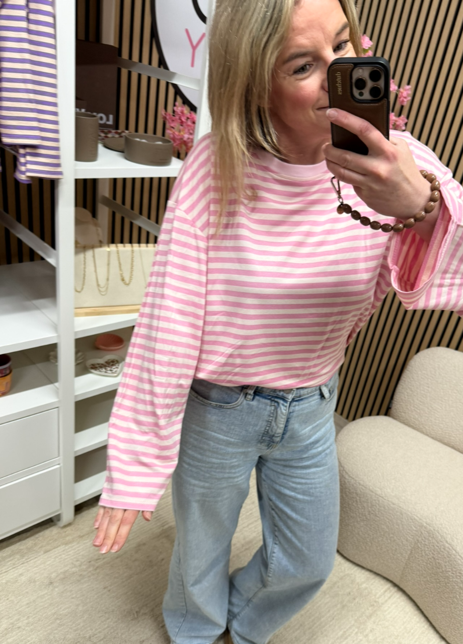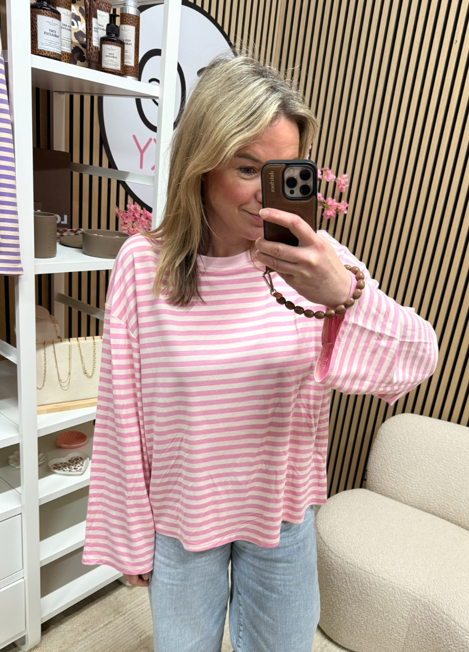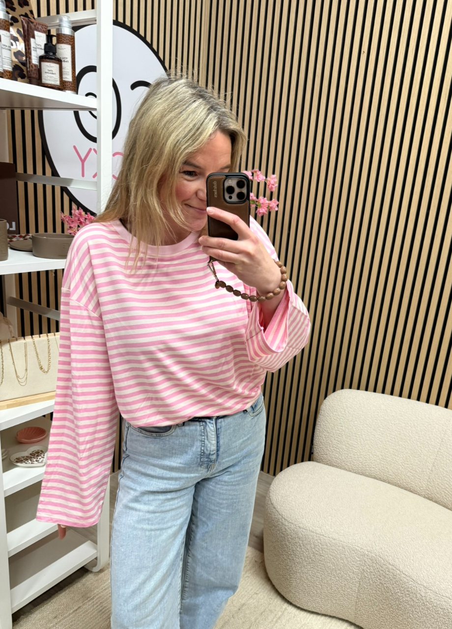 Gestreepte longsleeve Maud – roze/ecru – oversized langer model