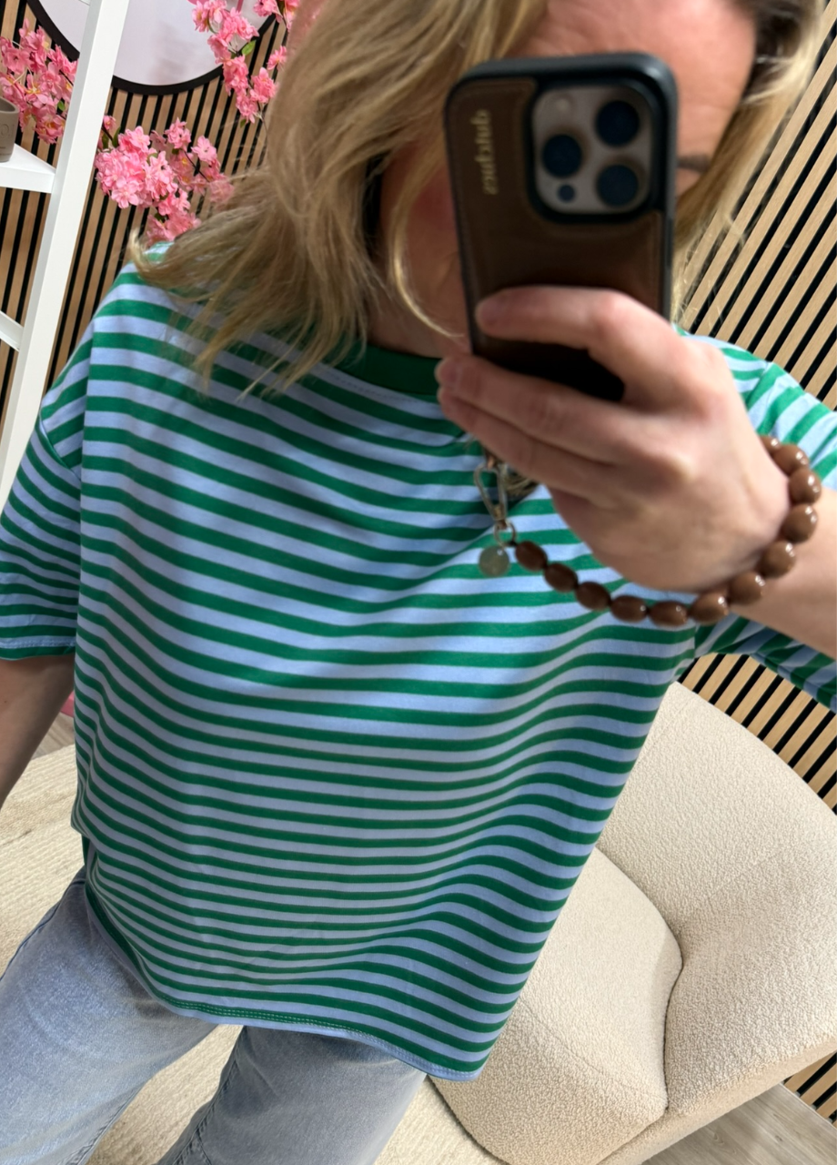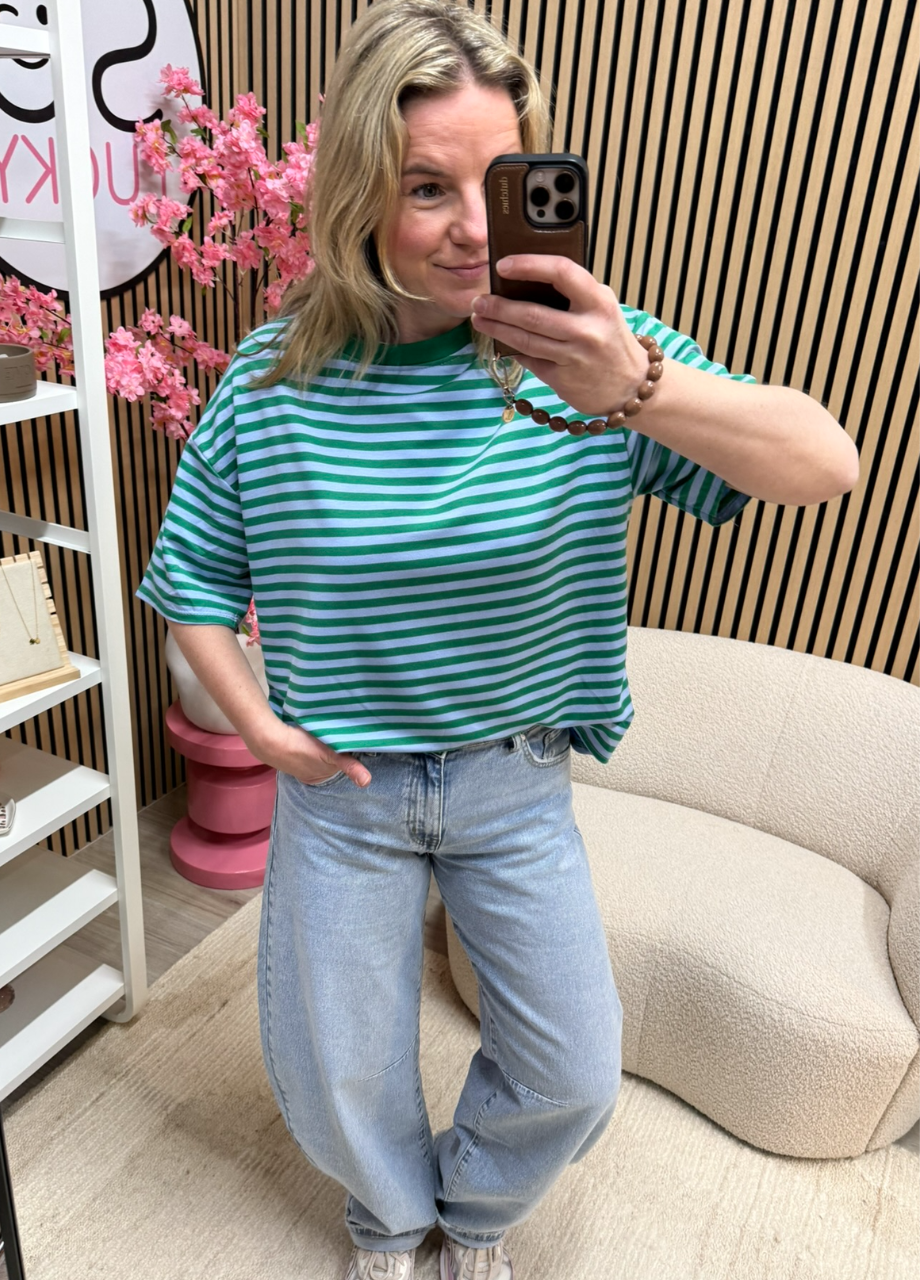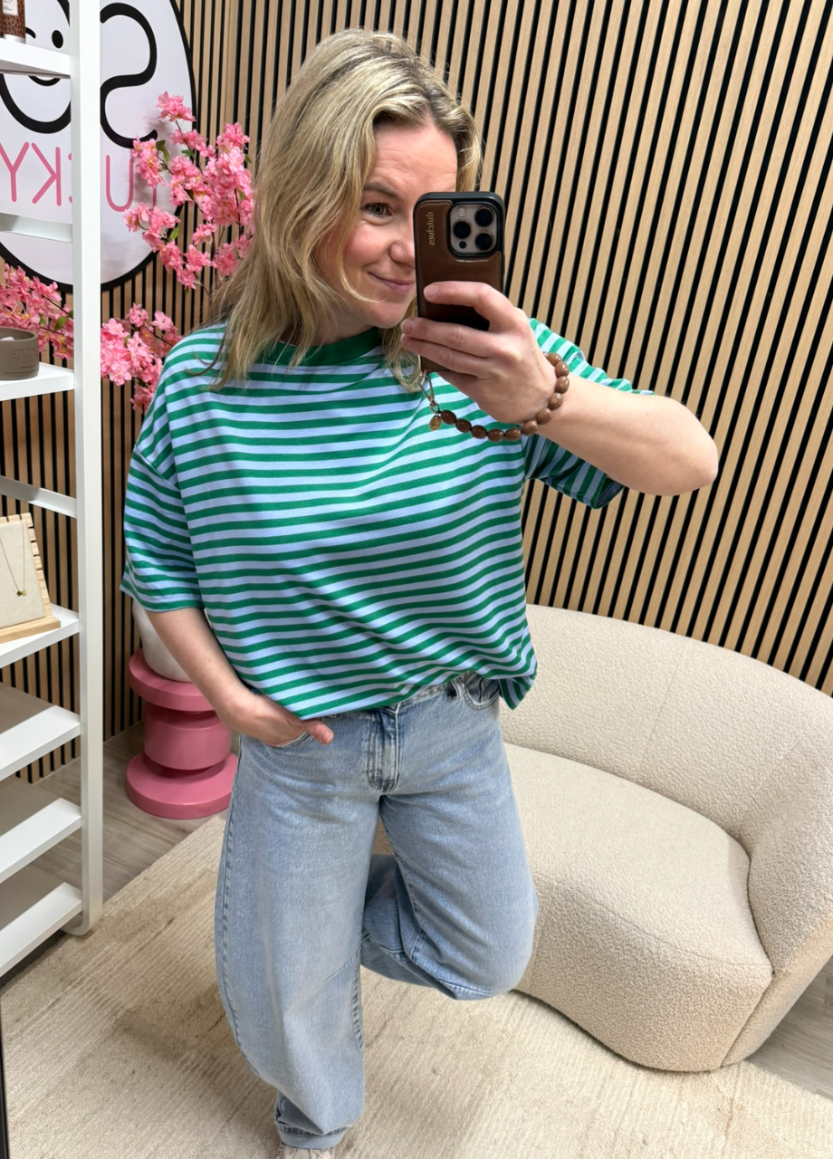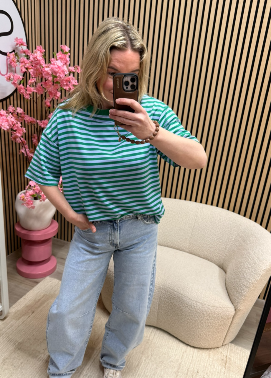 Deze gestreepte top Floor in groen/blauw is de korte mouw variant van de Maud. De mouwen vallen tot ongeveer de elleboog en de fit is lekker ruim. Combineer ’m met je favo jeans en je bent klaar.