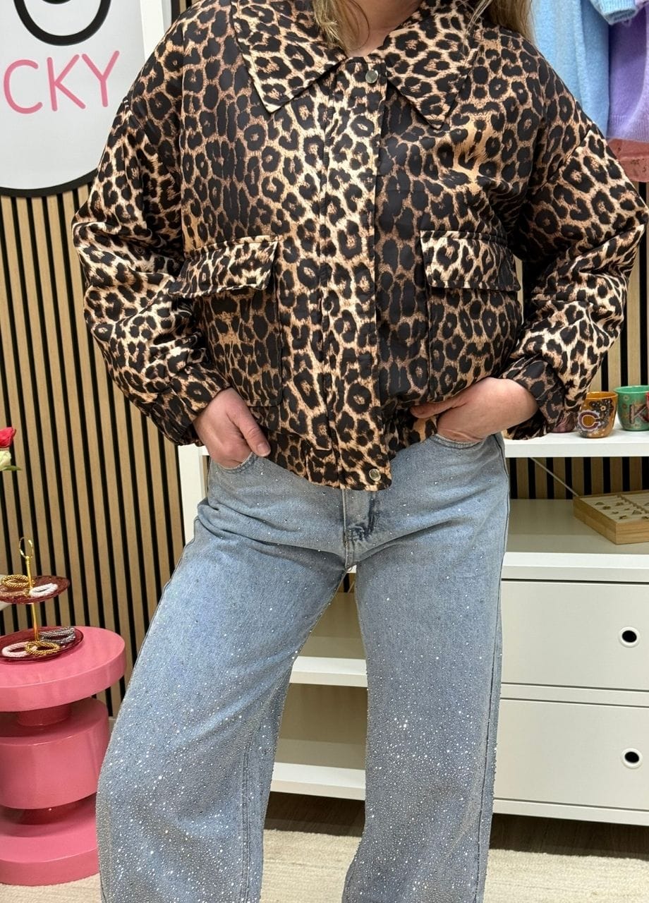 Deze trendy jas met panterprint is een echte eyecatcher! Het bomberjack model heeft zowel een rits als drukknopen. De jas is voorzien van twee steekzakken met klep en elastische boorden. Verkrijgbaar in de maten S/M en M/L, ideaal voor een stoere look.