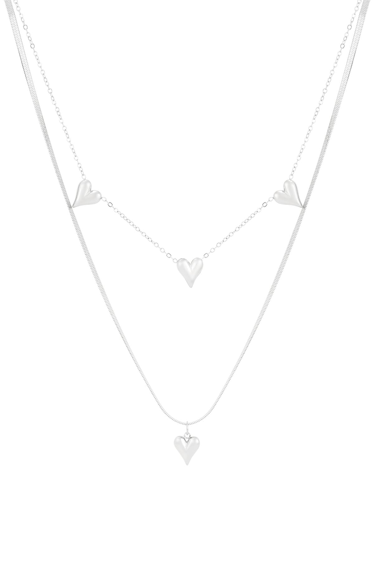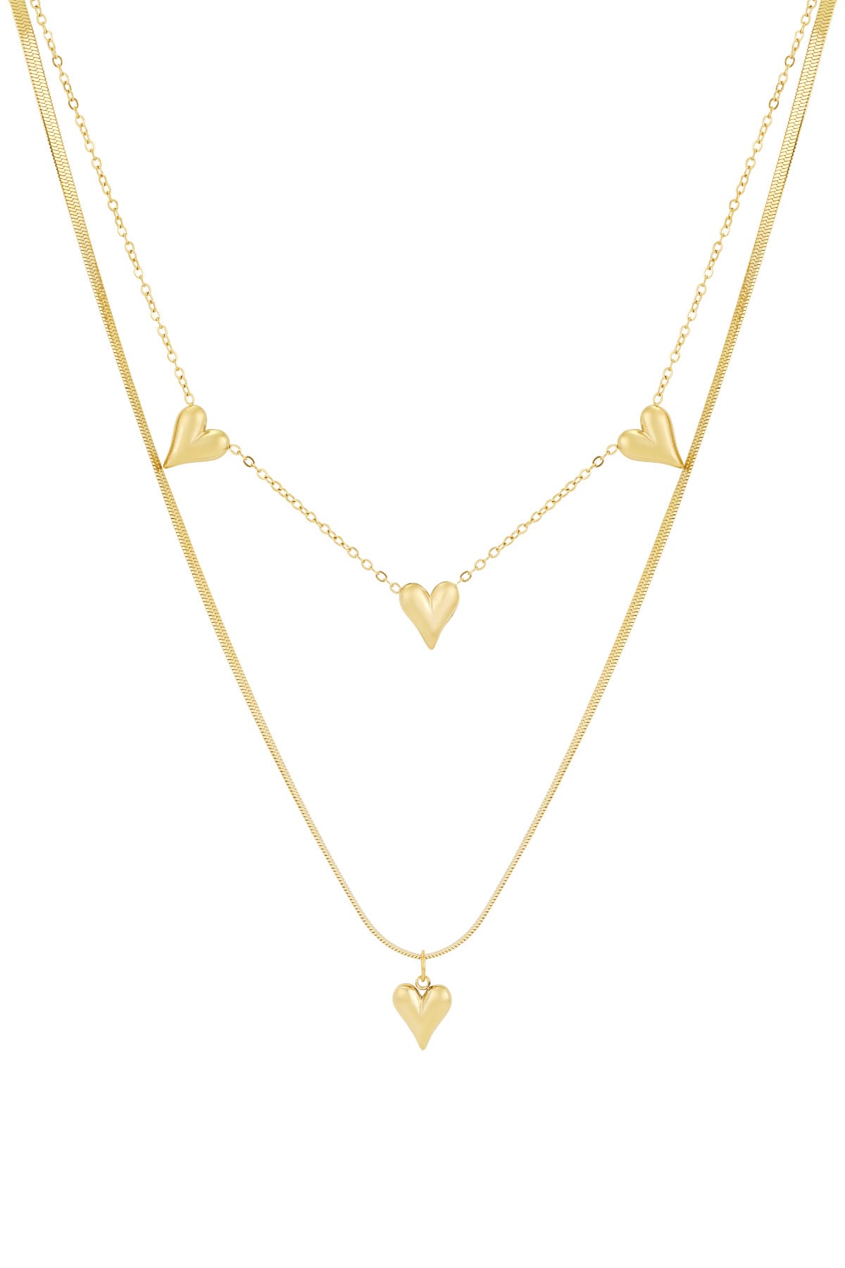Deze double layered ketting heeft twee verschillende soorten schakels met hartjes.
