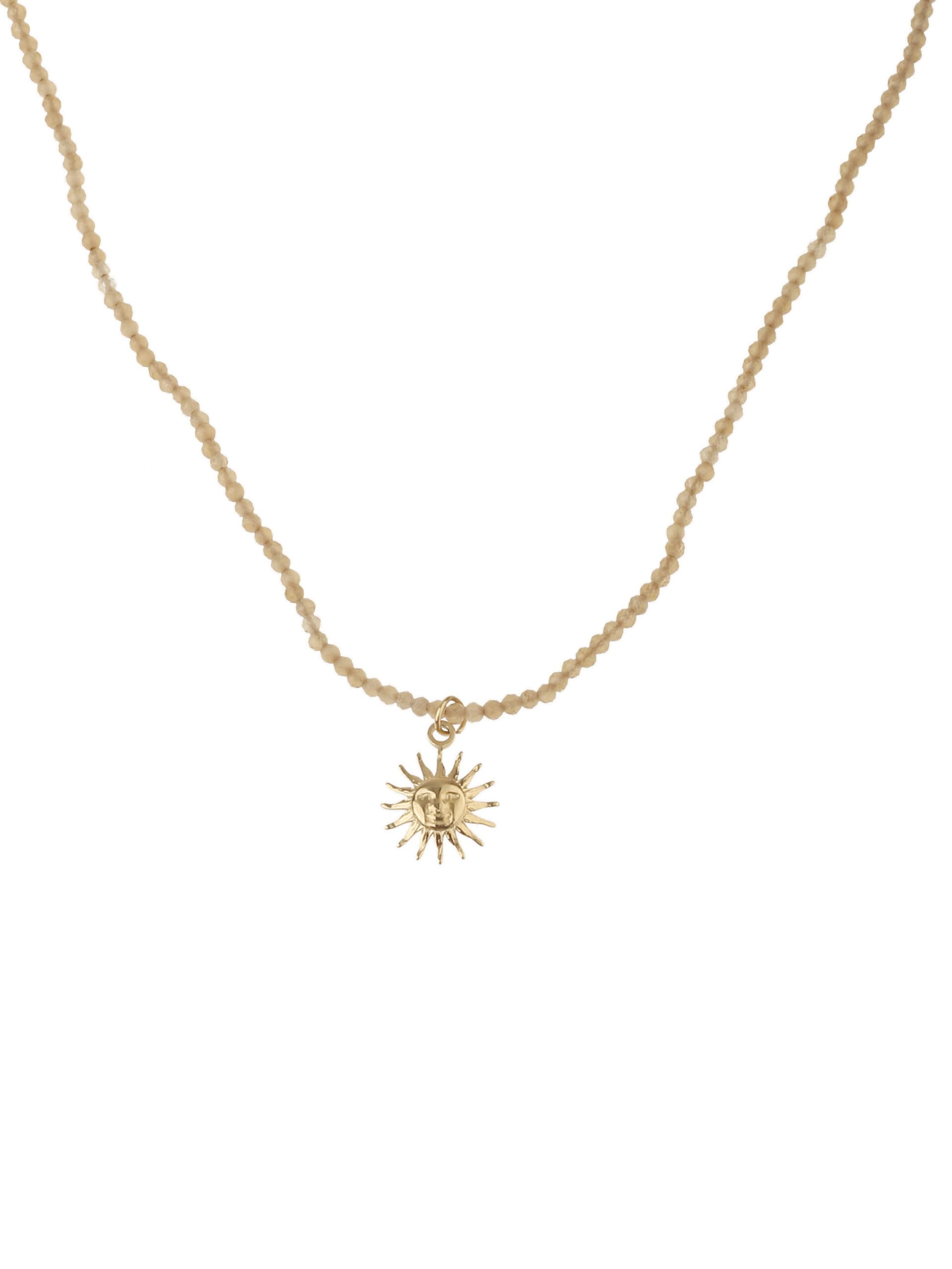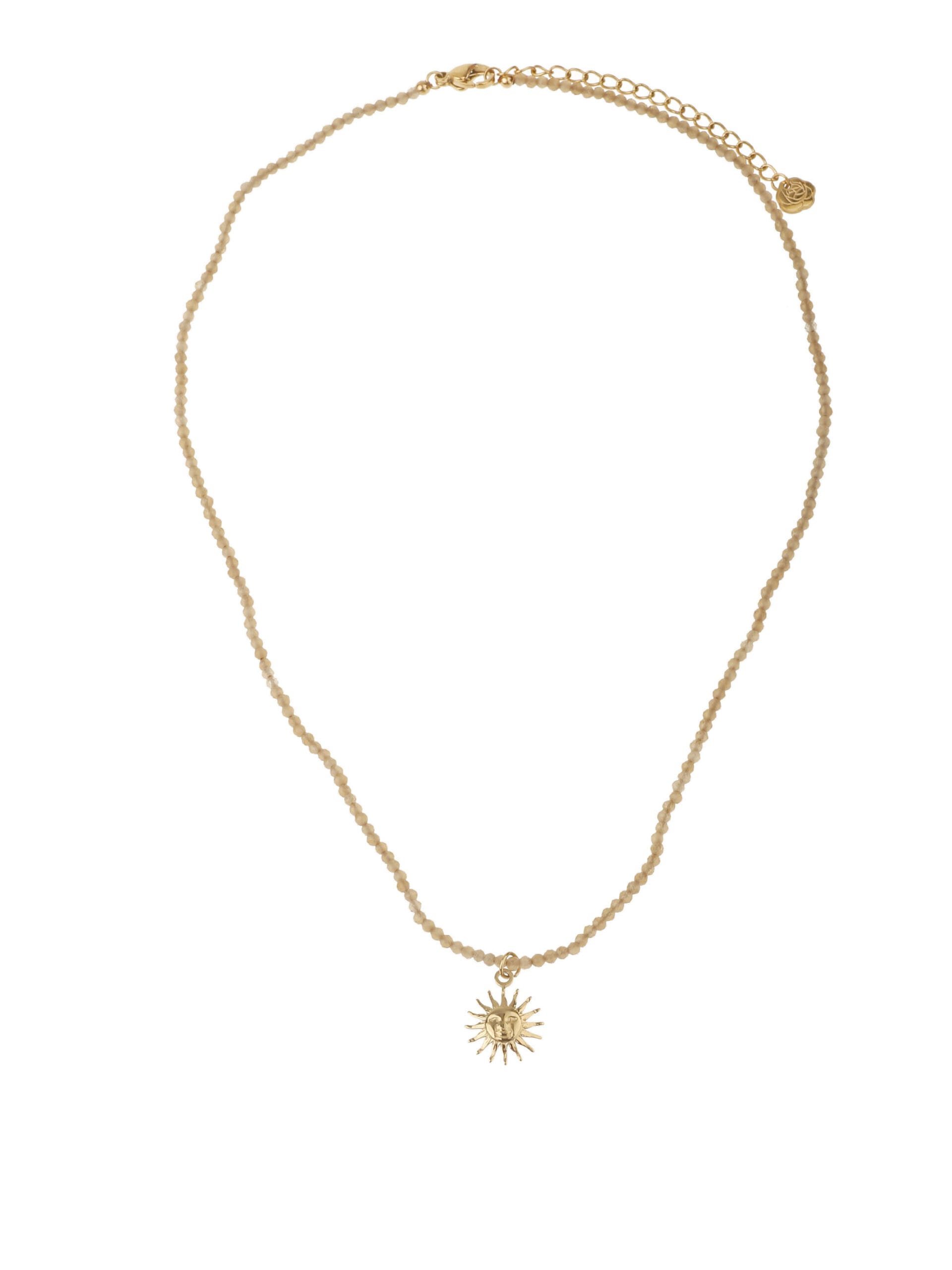 Deze ketting is voorzien van taupe kraaltjes die subtiel schitteren, met als bedel een prachtig gouden zonnetje. Het is een geweldige keuze om te combineren met een lange ketting.