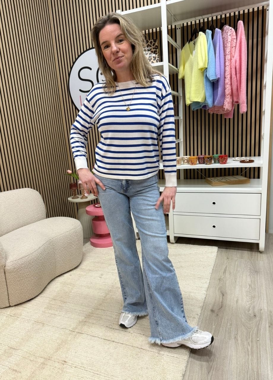 Deze dunne knit met streepjesmotief is van prachtige kwaliteit en een veelzijdige must-have! De one-size pasvorm is geschikt voor maten 36 t/m 40. Deze knit is het hele jaar door te dragen: in de winter onder een mooie blazer of bodywarmer, en in de zomer als een lichte, luchtige trui. Een tijdloos item dat je niet wilt missen!