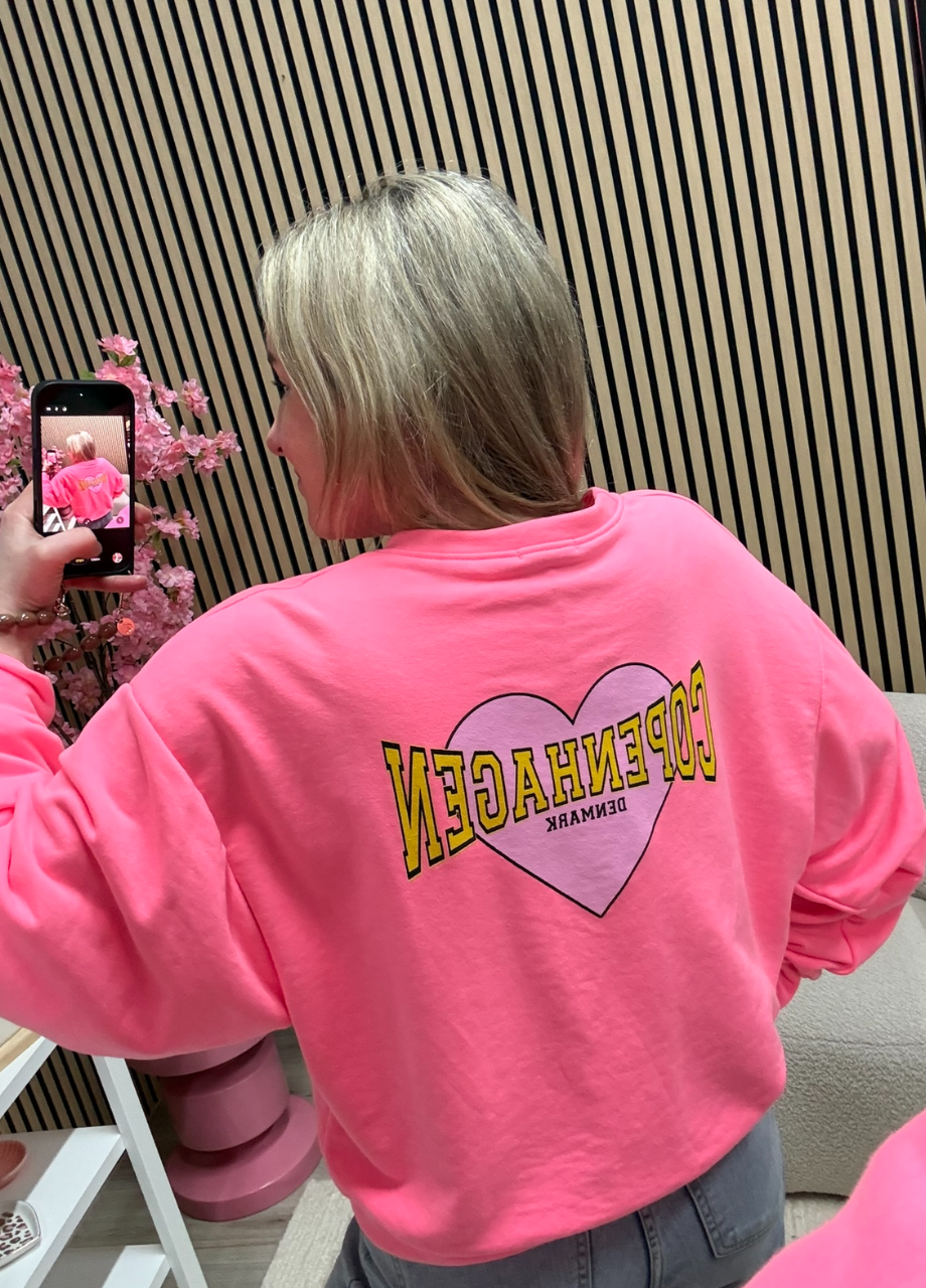 Neon roze trui met Copenhagen opdruk op de borst en een groot hart met Copenhagen op de achterkant. Ruime oversized fit met lage mouwen. Onesize en draagbaar t/m maat 42.
