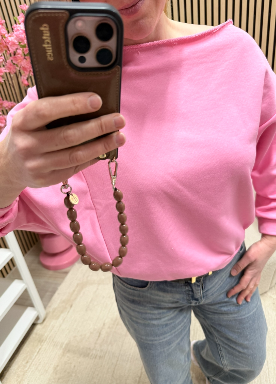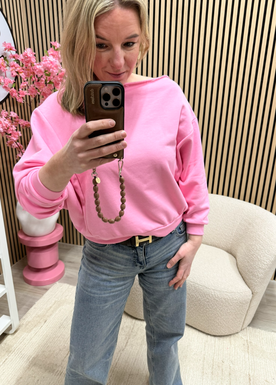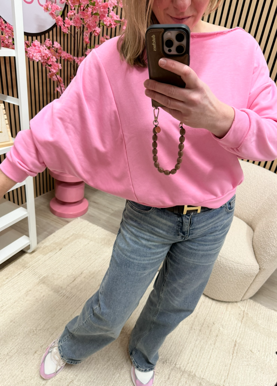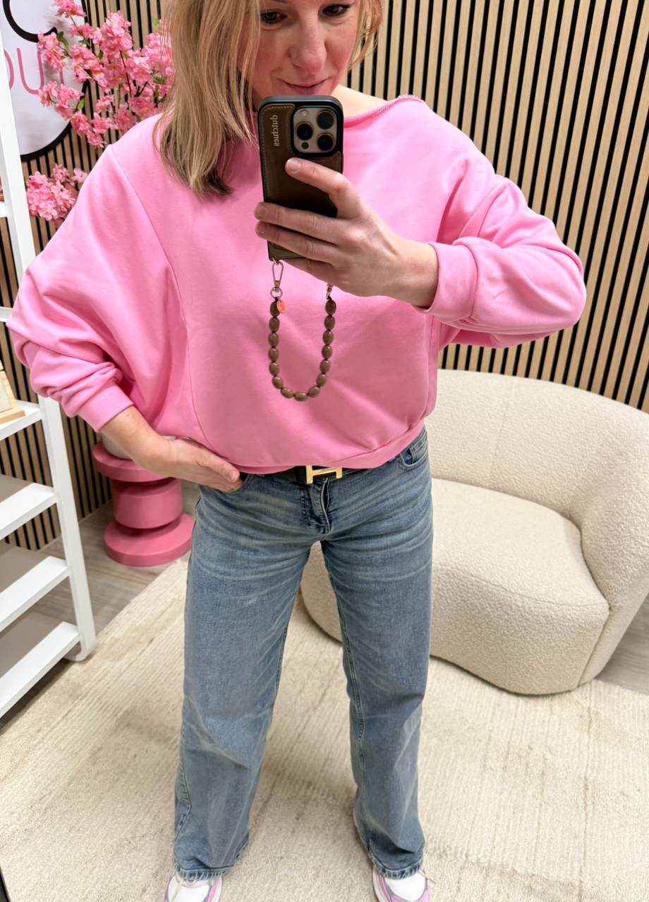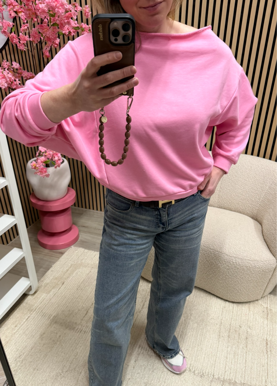 Off shoulder sweater roze met asymmetrische hals en wijde mouwen. Onesize model draagbaar tot en met maat 42. Door het model valt hij net even anders dan een gewone sweater.