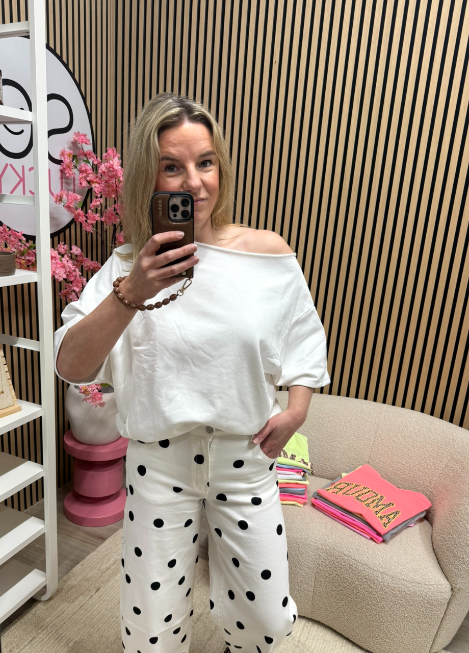 Off shoulder sweater in wit met korte mouwen en asymmetrische hals. Onesize model dat draagbaar is tot en met maat 42. De korte mouwen maken ’m net wat luchtiger dan de lange mouw variant.