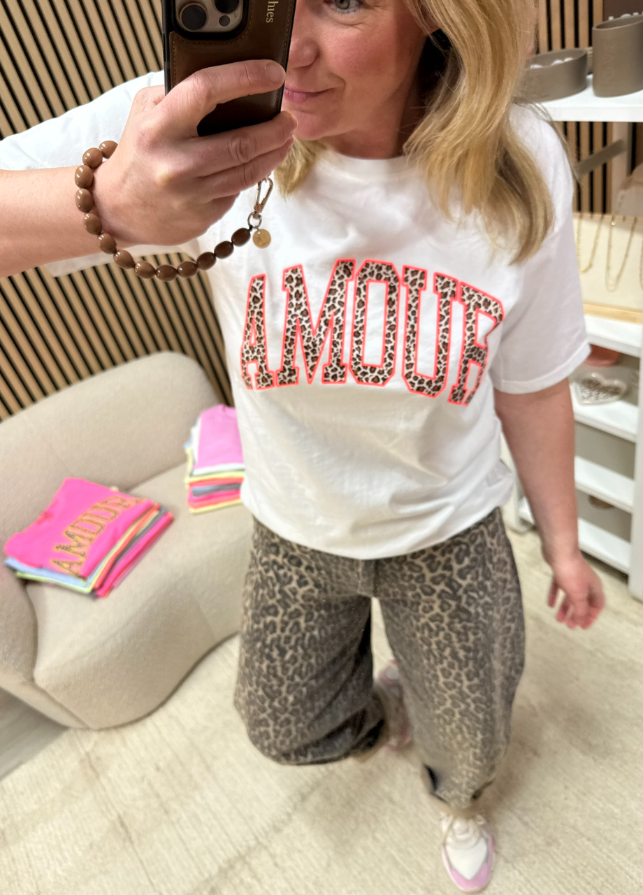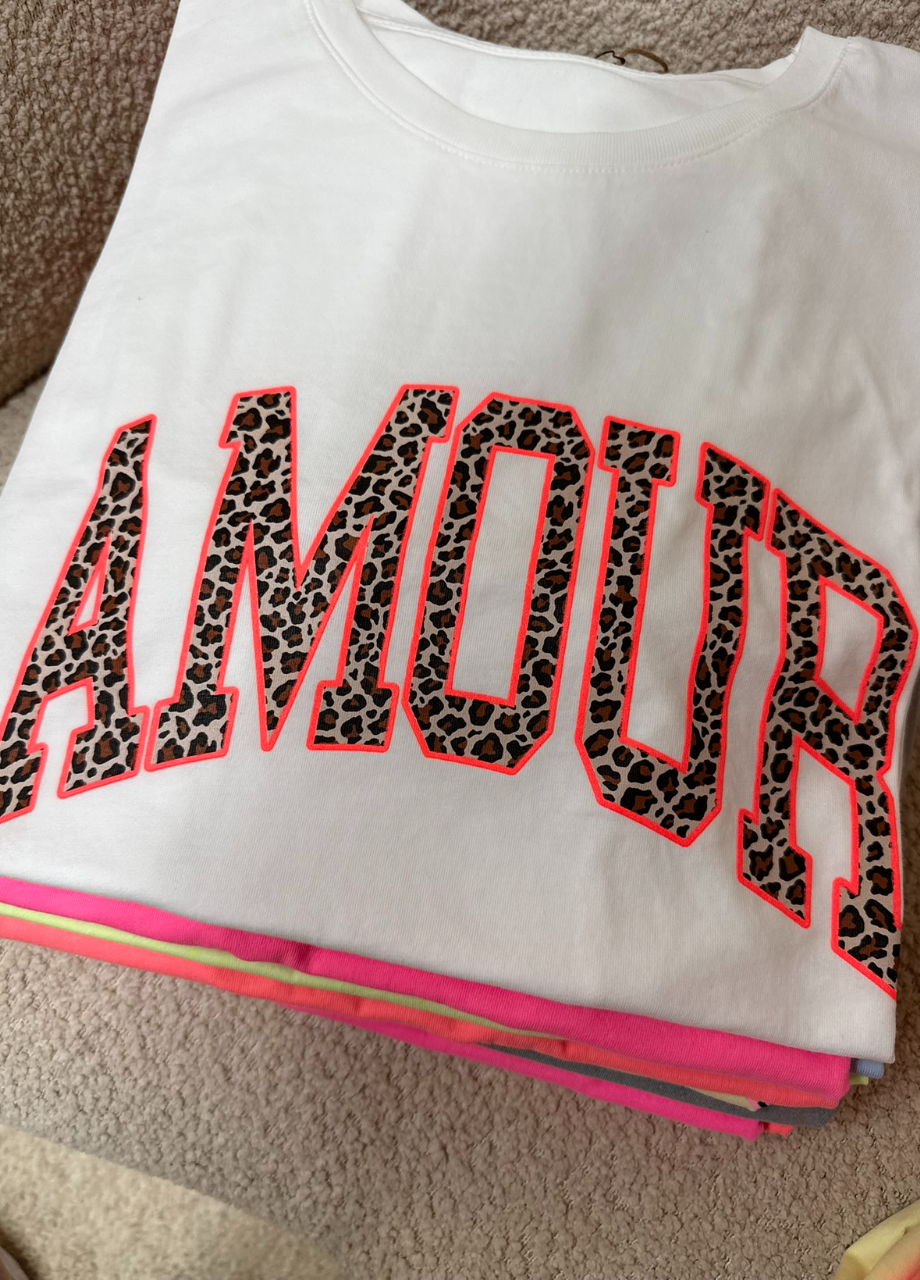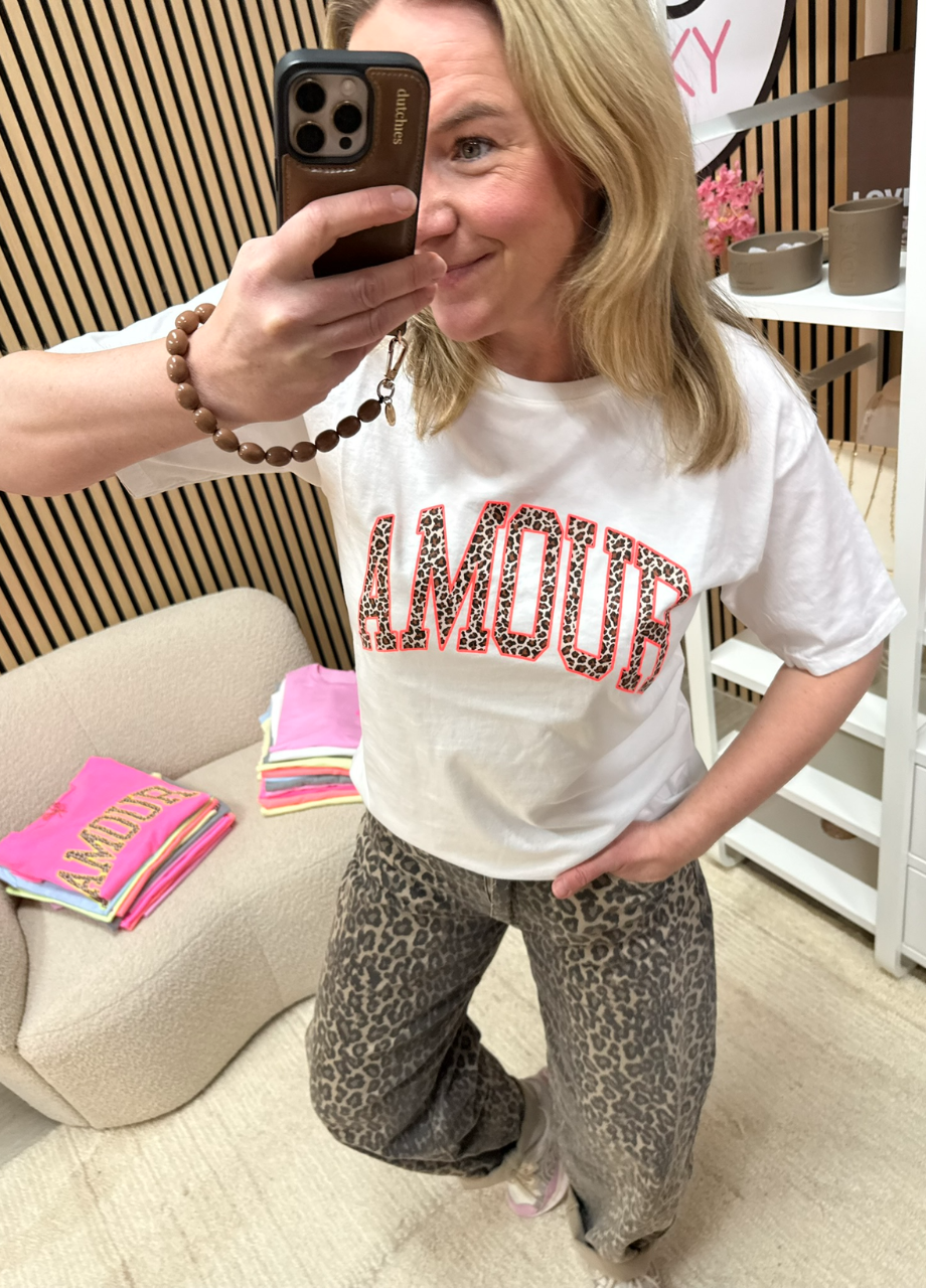 T-shirt met print Amour in wit met panterprint op de voorkant. Dit T-shirt met print is onesize en draagbaar tot en met maat 40-42. In kleinere maten valt hij oversized. Gemaakt van 100% katoen en leuk te tailleren door een stukje in je broek te stoppen.