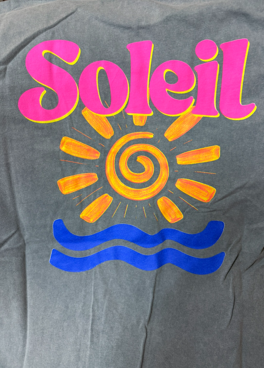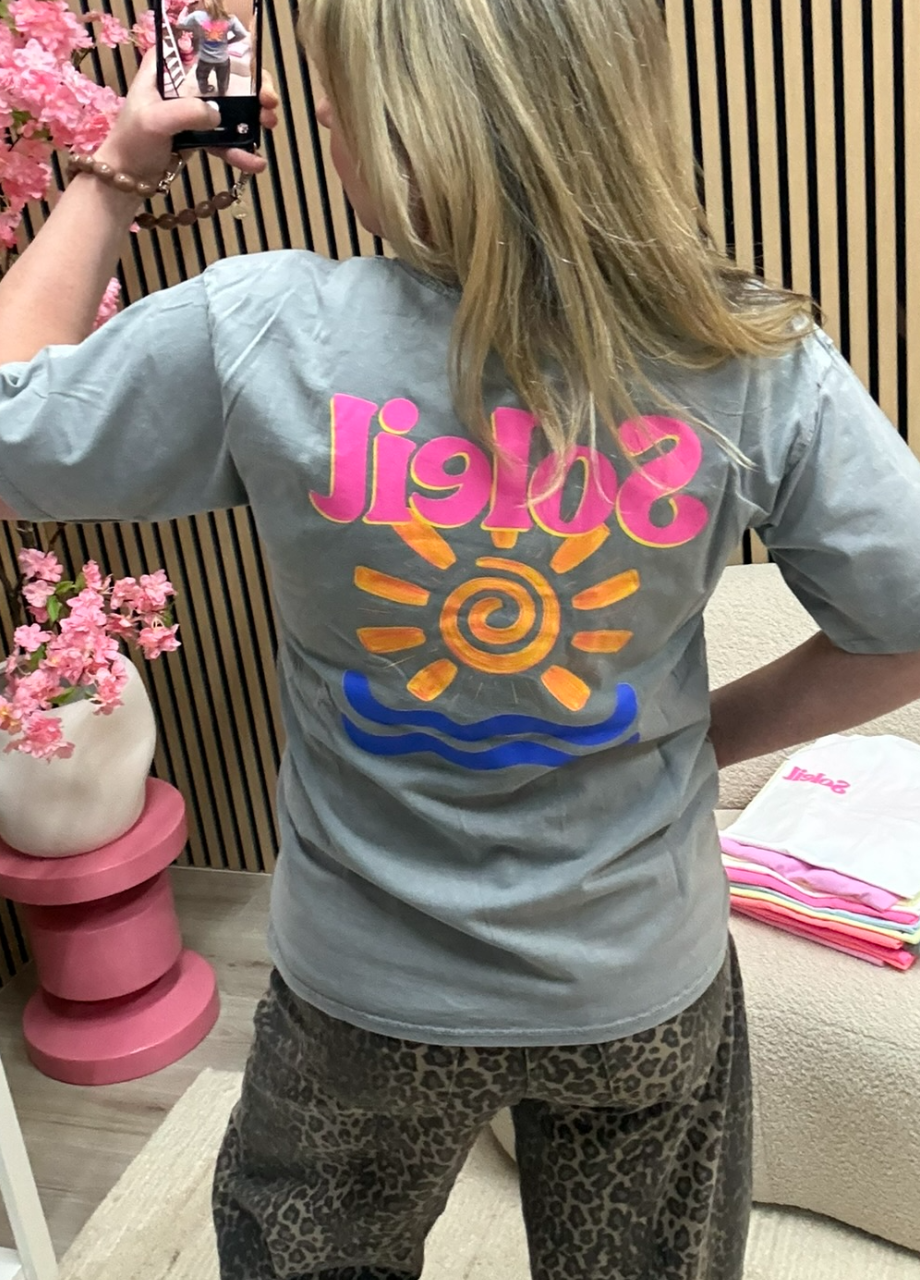 Dit T-shirt met print Soleil in grijs heeft een print op de borst met de tekst Soleil. Op de achterkant zit een grotere backprint met de tekst Soleil, een zon en de zee. Dat maakt dit T-shirt met print net even anders en extra leuk. De combinatie van een borstprint en backprint zorgt ervoor dat het shirt zowel van voren als van achteren opvalt.