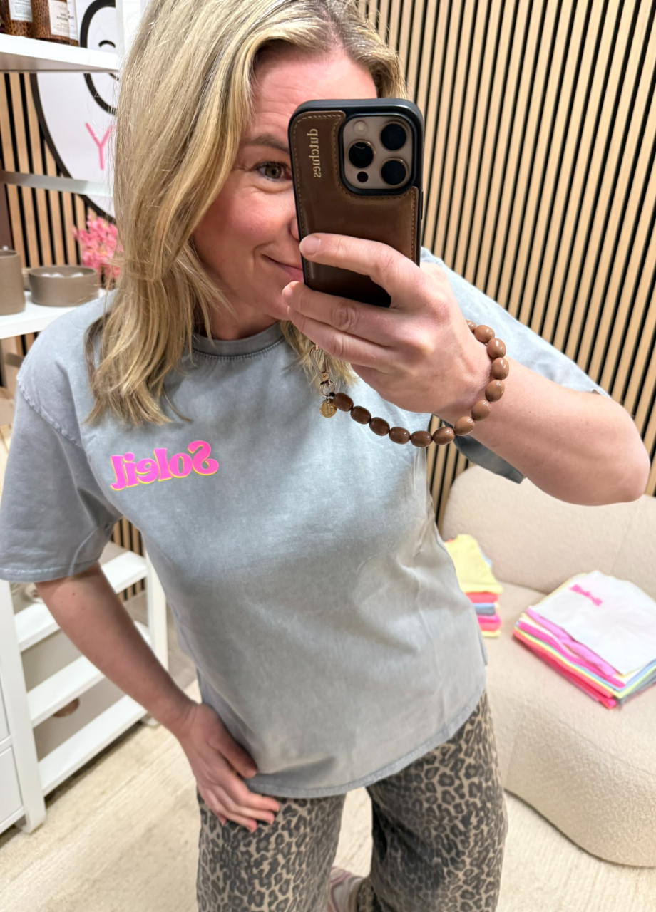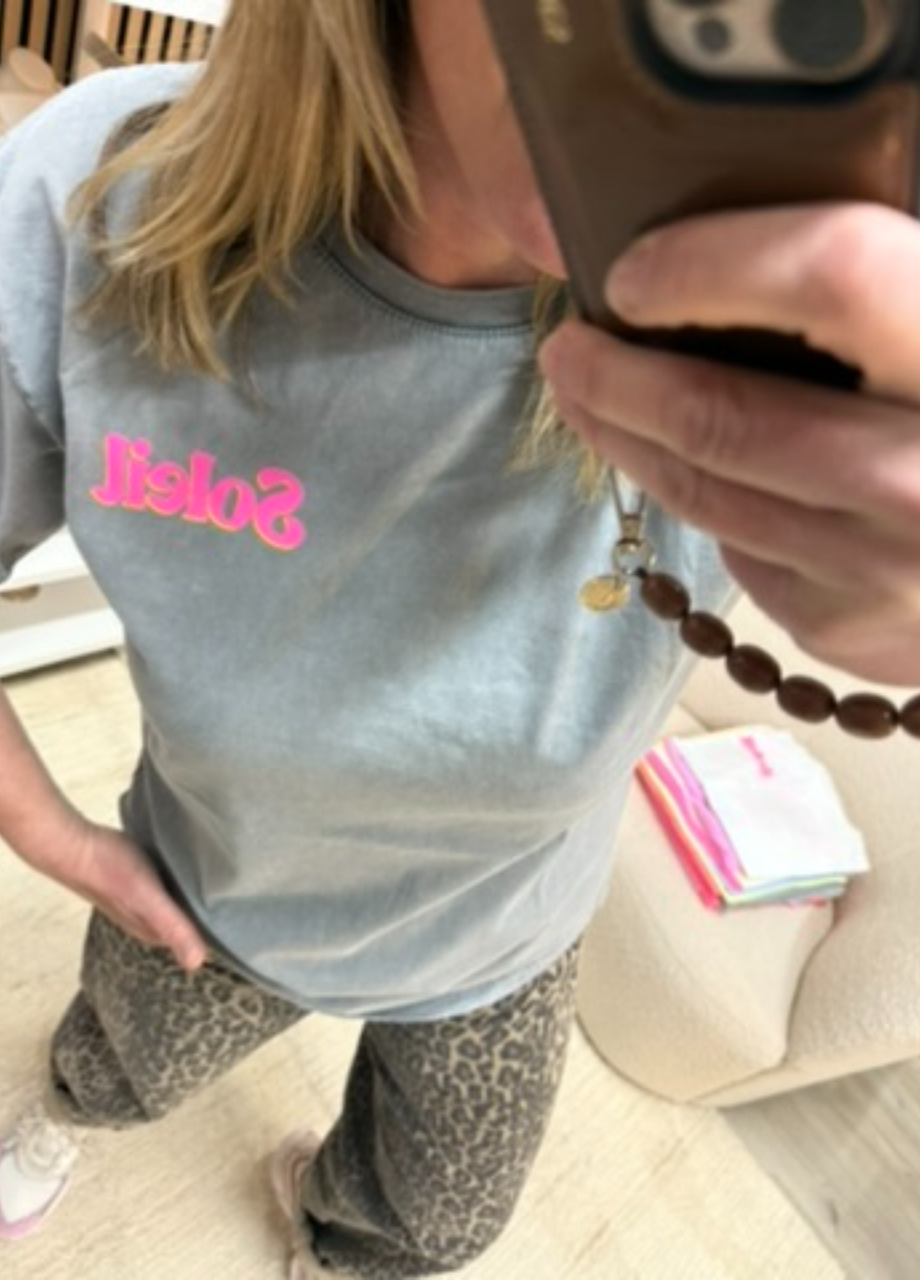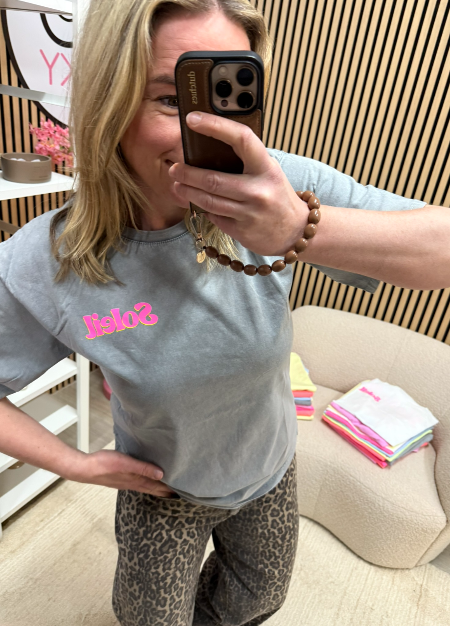 Door de print en de grijze kleur is een leuke jeans eronder al genoeg. Wil je het net even anders combineren, dan is dit T-shirt met print ook heel leuk met een bandana of een sjaaltje. Ook een longsleeve top eronder staat leuk, zeker als de mouwen of hals er net onderuit komen. Zo kun je het T-shirt met print Soleil ook dragen als het wat frisser is.
