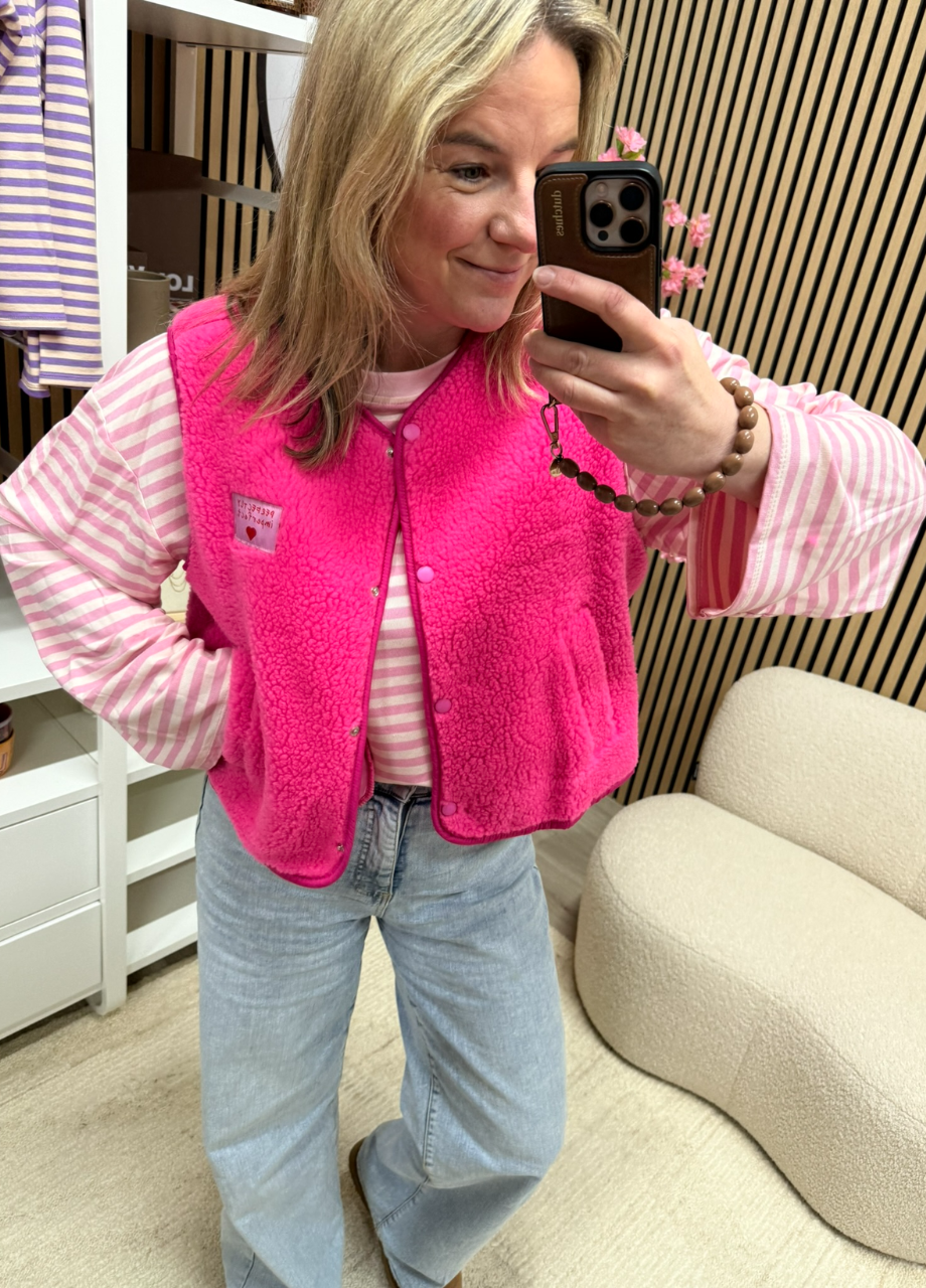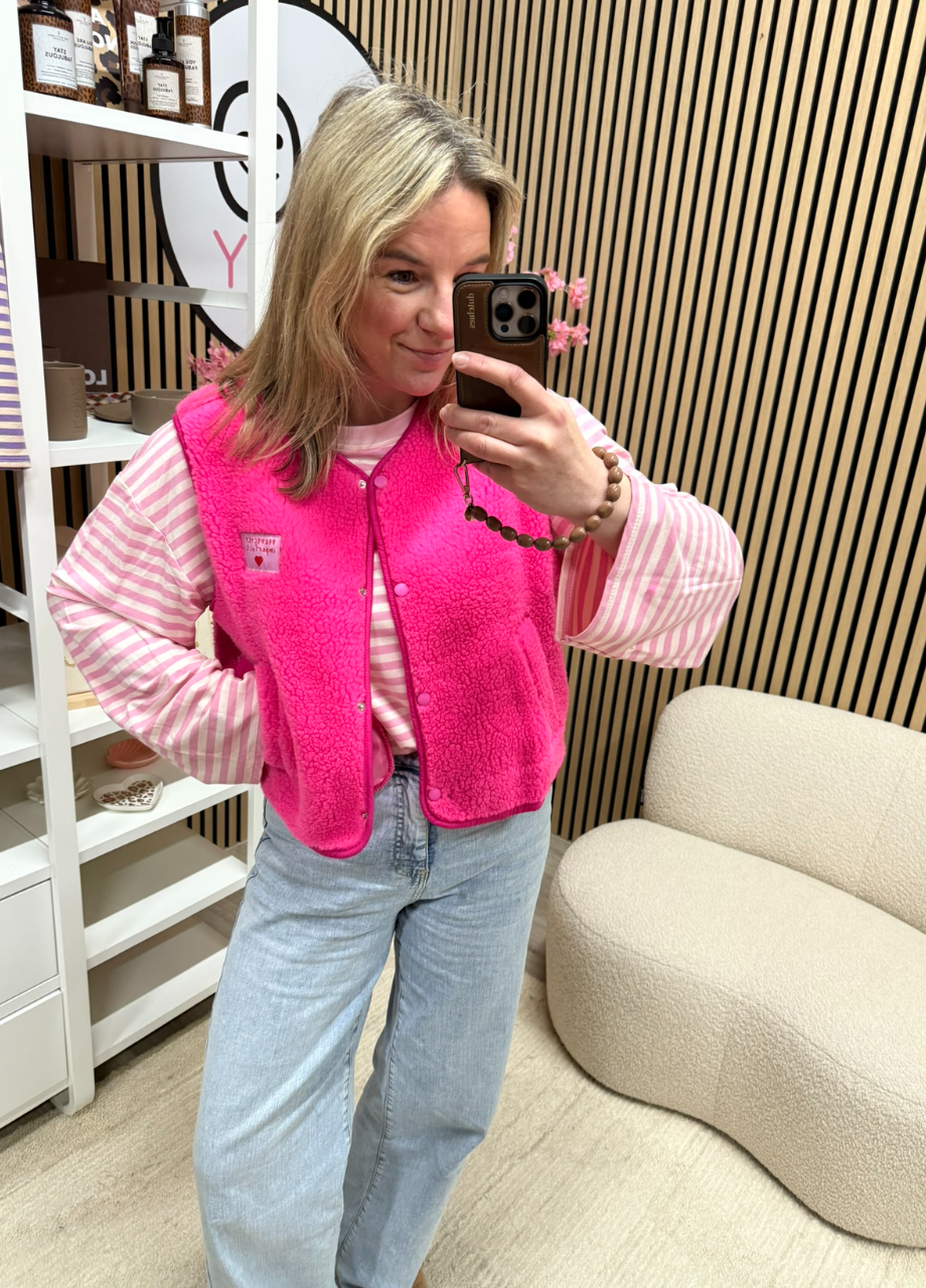 Deze teddy bodywarmer in roze is zo’n item dat je het hele jaar door draagt. In de winter over een lekkere knit, in het voorjaar over een longsleeve of blouse en in de zomer gewoon met een T-shirt. Het gilet is al leuk genoeg, dus een basic eronder werkt perfect.